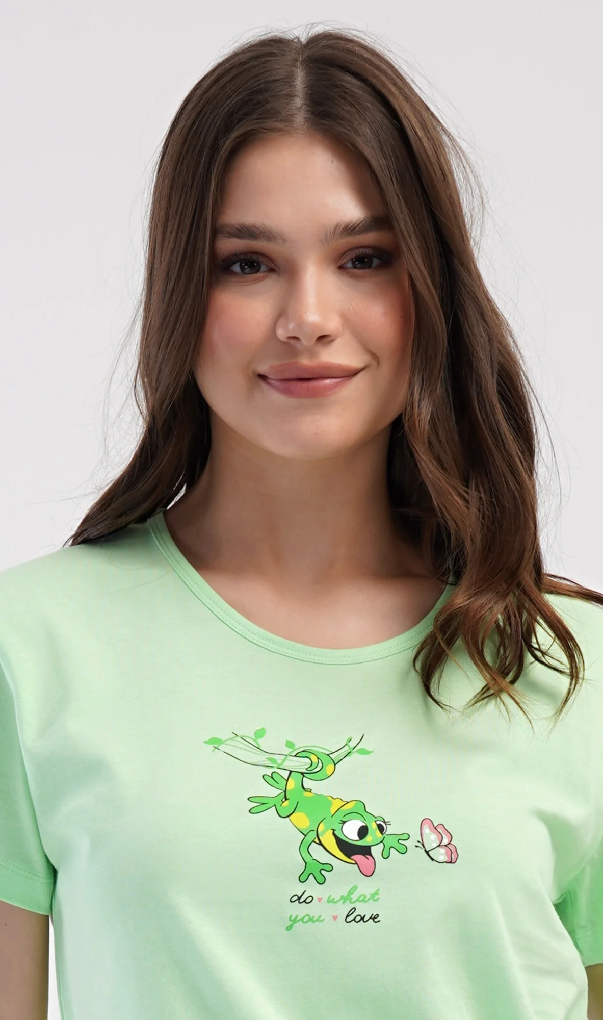Dámské bavlněné kapri pyžamo Ella. Dámské pyžamo se skládá z trička s krátkým rukávem a tříčtvrtečních kalhot. Tričko s kulatým výstřihem zdobí obrázek veselé ještěrky. Tento motiv se opakuje i na kalhotách, které mají v pase gumu a šňůrku na stažení, jsou bez kapes. Použitý bavlněný materiál je příjemný a poddajný na dotek. Pokyny pro údržbu: - 100% bavlna- lze prát v pračce při teplotě do 30°- nesušit v sušičce- žehlit z rubu do 110°- nepoužívat bělící prostředky- nečistit chemicky Míry naměřené na výrobku: 4082816820 Elia S M L XL obvod hrudníku 90 94 98 102 délka trika 63 64 65 66 pas 74-86 76-98 78-90 80-92