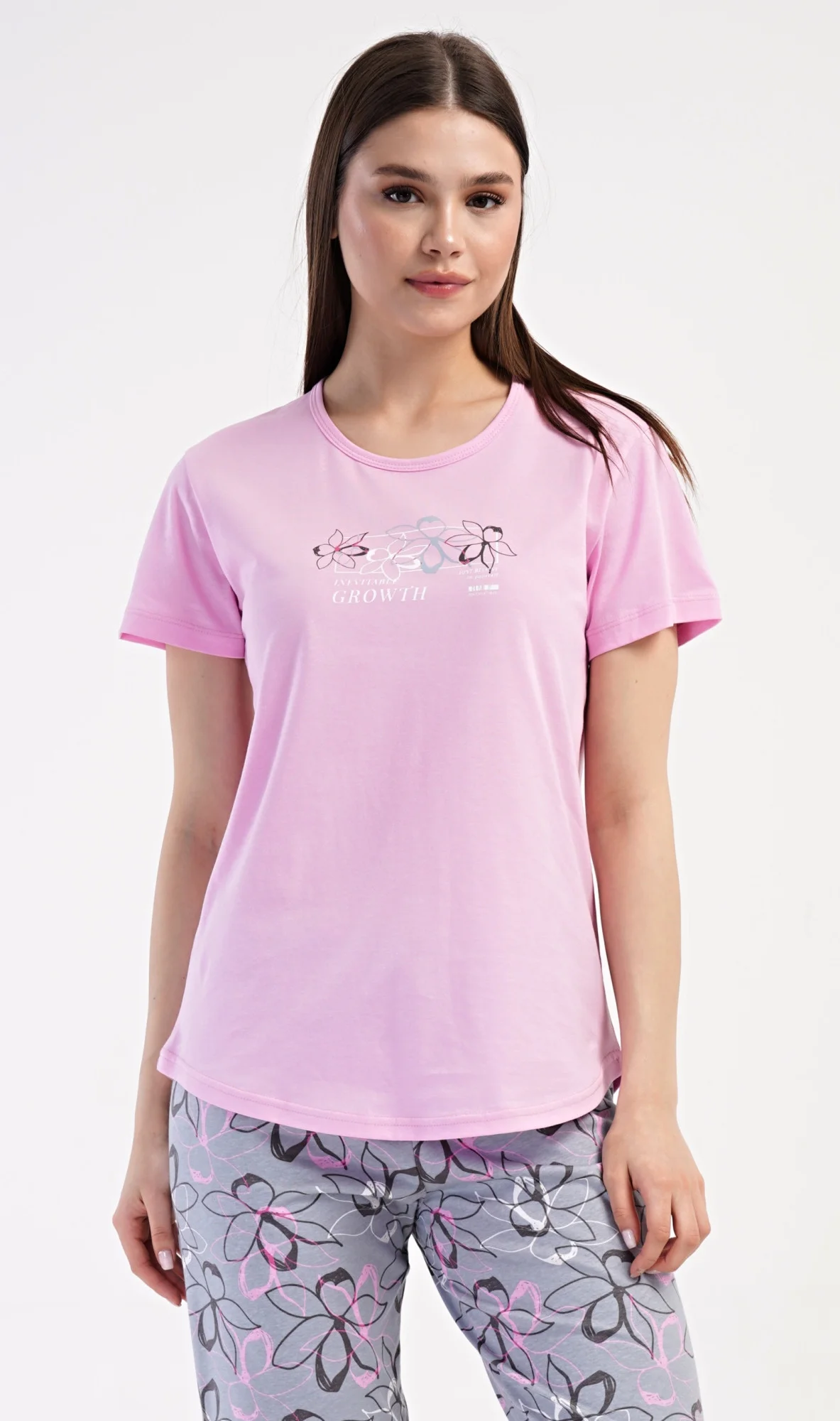 Dámské bavlněné kapri pyžamo Mia. Dámské pyžamo se skládá z trička s krátkým rukávem a tříčtvrtečních kalhot. Tričko s kulatým výstřihem zdobí na hrudi obrázek květin. Tento motiv se opakuje i na kalhotách, které mají v pase gumu a šňůrku na stažení, jsou bez kapes. Použitý bavlněný materiál je příjemný a poddajný na dotek. 4082435598 Mia M L XL XXL obvod hrudníku 94 98 102 106 délka trika 64 65 65 67 pas 74 86 78-90 84-96 86-98