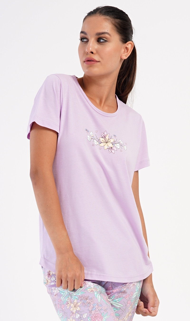 Dámské bavlněné kapri pyžamo Viola. Dámské pyžamo se skládá z trička s krátkým rukávem a tříčtvrtečních kalhot. Tričko s kulatým výstřihem má na hrudi obrázek květů. Tento motiv se opakuje i na kalhotách, které mají v pase gumu a šňůrku na stažení, jsou bez kapes. Použitý bavlněný materiál je příjemný a poddajný na dotek. Pokyny pro údržbu: - 100% bavlna - lze prát v pračce při teplotě do 30° - nesušit v sušičce - žehlit z rubu do 110° - nepoužívat bělící prostředky - nečistit chemicky Míry naměřené na výrobku: 4050800475 Viola L XL XXL obvod hrudníku 96 100 108 délka trika 65 67 68 pas 76-88 78-90 80-92
