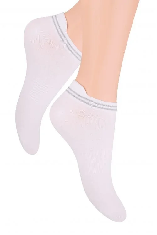 Dámske členkové ponožky s jazykom. Ušité sú z bavlny (54%) a polyamidu (42%) s prídavkom elastanu. Vďaka špeciálnemu tvaru sa nesesouvají z chodidla. V hornej časti sú dva prúžky s nitkou lurex.