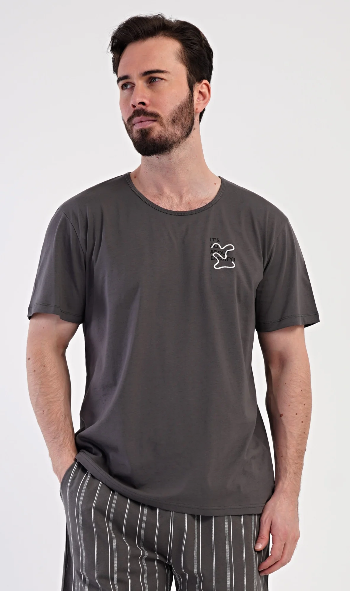 Pánské bavlněné šortkové pyžamo Nathan. Pánské pyžamo se skládá z trička s krátkým rukávem a krátkých šortkových kalhot. Jednobarevné tričko s kulatým výstřihem zdobí na hrudi drobný obázek. Tričko doplňují pruhované šortky, které mají v pase gumu, šňůrku na stažení a praktické kapsy. Použitý materiál s obsahem bavlny 100% je příjemný a poddajný na dotek. Pokyny pro údržbu: -100 % bavlna- lze prát v pračce při teplotě do 30°- nesušit v sušičce- žehlit z rubu do 110°- nepoužívat bělící prostředky- nečistit chemicky Míry naměřené na výrobku: 4080841374 Nathan M L XL XXL obvod hrudníku 104 108 112 116 délka trika 73 73 74 74 pas 76-88 86-88 88-100 90-102 délka šortek 48 49 50 51