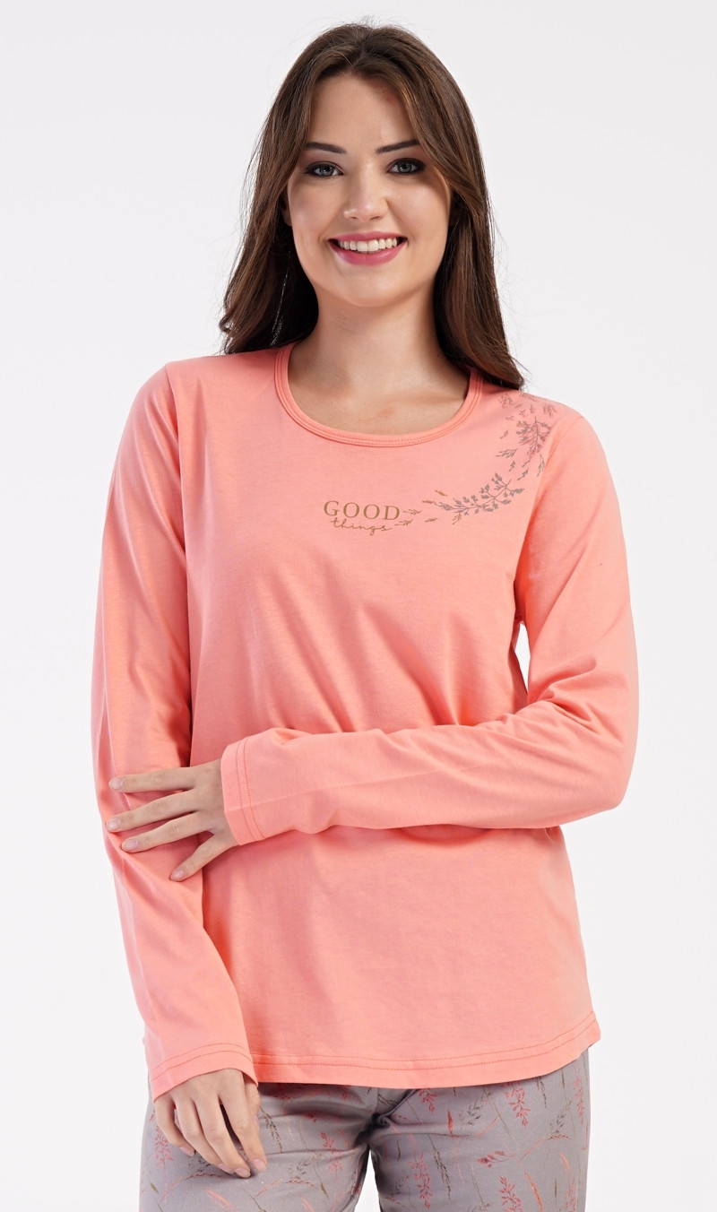 Dámské bavlněné dlouhé pyžamo Good things. Dámské pyžamo se skládá z trika s dlouhým rukávem a dlouhých kalhot. Triko je jednobarevné, zdobené menším obrázkem a nápisem 'Good things'. Kalhoty mají v pase gumu a šňůrku na stažení, nemají kapsy. Použitý bavlněný materiál je poddajný a příjemný na dotek. Pokyny pro údržbu: - 100% bavlna - lze prát v pračce při teplotě do 30° - nesušit v sušičce - žehlit z rubu do 110° - nepoužívat bělící prostředky - nečistit chemicky Míry naměřené na výrobku 4033010658 Good things L XL XXL obvod hrudníku 98 102 106 délka trika 65 67 68 pas 80-92 82-94 84-96 délka kalhot 103 104 105