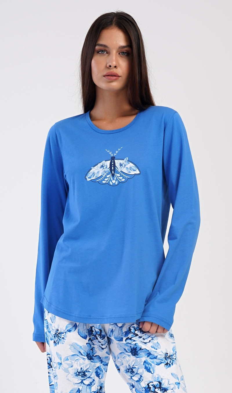 Dámské dlouhé bavlněné pyžamo Dominika. Dámské pyžamo se skládá z trika s dlouhým rukávem a dlouhých kalhot. Triko je jednobarevné, zdobené obrázkem motýla a květů. Květinový potisk se opakuje i na kalhotách, které mají v pase gumu a šňůrku na stažení, nemají kapsy. Použitý bavlněný materiál je poddajný a příjemný na dotek. Pokyny pro údržbu: - 100% bavlna - lze prát v pračce při teplotě do 30° - nesušit v sušičce - žehlit z rubu do 110° - nepoužívat bělící prostředky - nečistit chemicky Míry naměřené na výrobku: 4050030074 Dominika 1XL 2XL 3XL 4XL obvod hrudníku 110 114 118 122 délka trika 70 72 73 74 pas 82-94 84-96 86-98 88-100 délka kalhot 108 109 110 111