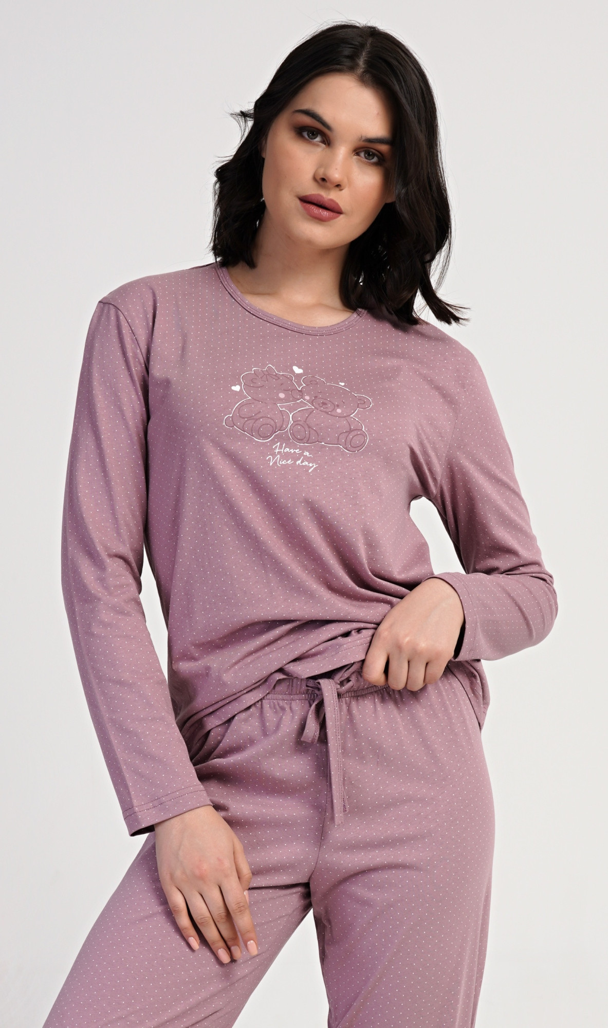 Dámské bavlněné dlouhé pyžamo Emily. Dámské pyžamo se skládá z trika s dlouhým rukávem a dlouhých kalhot. Triko je potištěno puntíky a zdobené obrázkem dvou medvídků. Potisk puntíků se opakuje i na kalhotách, které mají v pase gumu a šňůrku na stažení, nemají kapsy. Použitý bavlněný materiál je poddajný a příjemný na dotek. Pokyny pro údržbu: - 100% bavlna - lze prát v pračce při teplotě do 30° - nesušit v sušičce - žehlit z rubu do 110° - nepoužívat bělící prostředky - nečistit chemicky Míry naměřené na výrobku: 5040087997 Emily S M L obvod hrudníku 94 98 100 délka trika 65 65 65 pas 74-86 76-88 78-90 délka kalhot 102 102 102