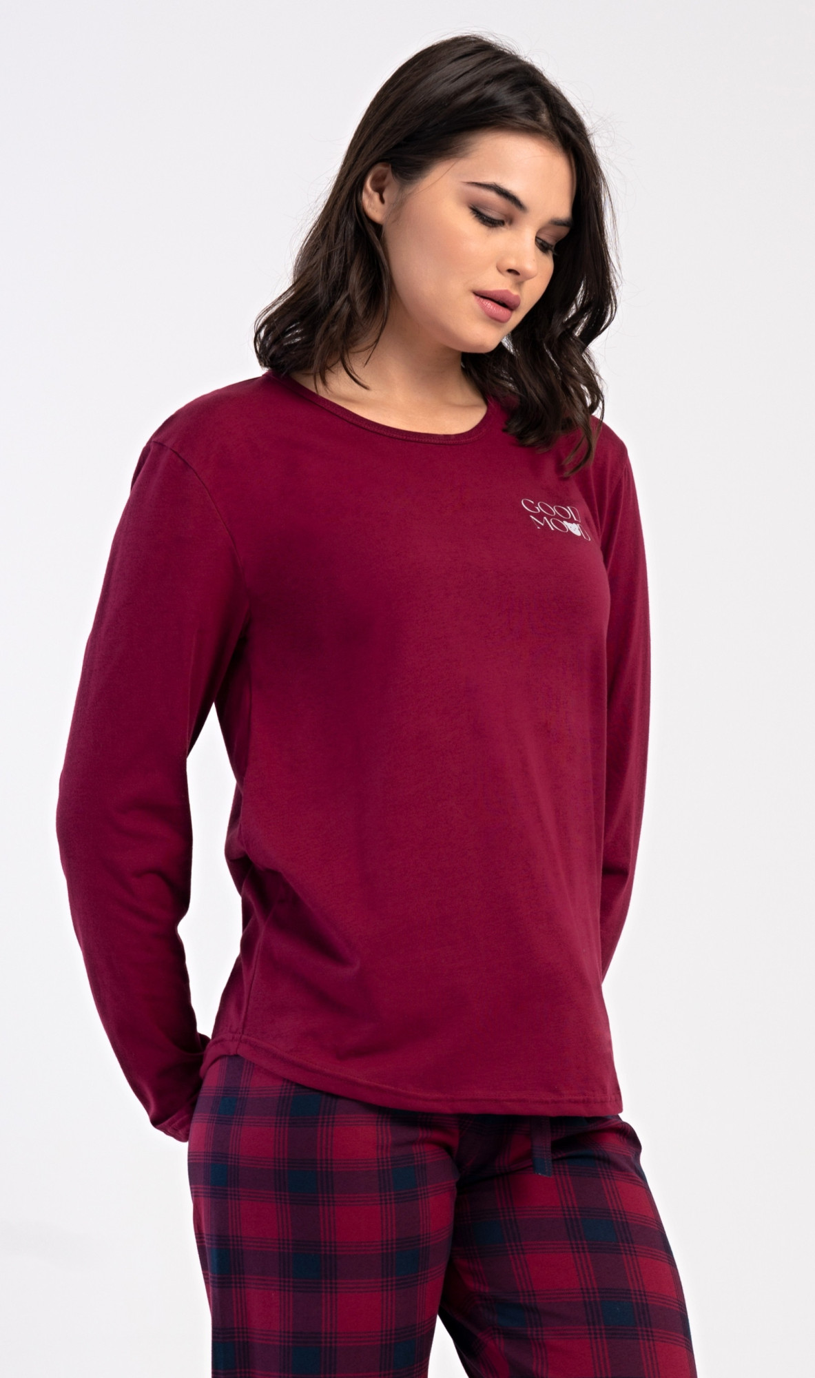 Dámské bavlněné dlouhé pyžamo Emma. Dámské pyžamo se skládá z trika s dlouhým rukávem a dlouhých kalhot. Jednobarevné triko s kulatým výstřihem zdobí na hrudi drobný nápis. Kárované kalhoty mají v pase gumu a šňůrku na stažení, nemají kapsy. Použitý bavlněný materiál je poddajný a příjemný na dotek. Pokyny pro údržbu: - 100% bavlna - lze prát v pračce při teplotě do 30° - nesušit v sušičce - žehlit z rubu do 110° - nepoužívat bělící prostředky - nečistit chemicky Míry naměřené na výrobku 5031372334 Emma S M L XL obvod hrudníku 88 92 96 100 délka trika 62 62 63 63 pas 72-84 74-86 76-88 78-90 délka kalhot 99 99 99 99