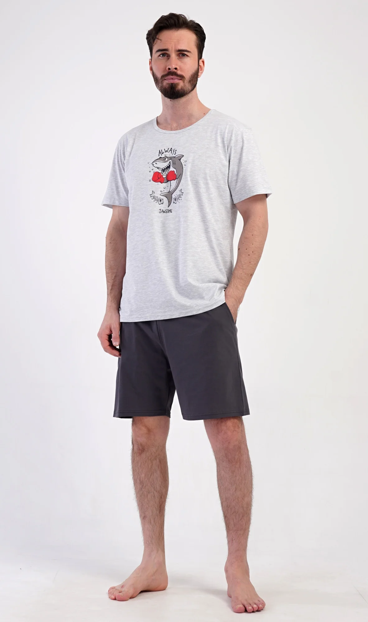 Pánské šortkové pyžamo Žralok. Pánské pyžamo se skládá z trička s krátkým rukávem a krátkých šortkových kalhot. Na tričku je obrázek žraloka. Šortky mají kapsy, v pase gumu a šňůrku na stáhnutí. Použitý materiál je příjemný a poddaný na dotek. Obsah bavlny u trička je 70% a u šortek 100%. Pyžamo je vhodné i na denní nošení a oceníte ho obzvlášť v horkých letních dnech. Pokyny pro údržbu: - 70% bavlna, 30% polyester- lze prát v pračce při teplotě do 30°- nesušit v sušičce- žehlit z rubu do 110°- nepoužívat bělící prostředky- nečistit chemicky Míry naměřené na výrobku 4084420000 Žralok 1XL 2XL 3XL 4XL obvod hrudníku 124 128 132 136 délka trika 73 74 75 76 pas 90-102 92-104 94-106 96-108 délka šortek 47 48 49 50