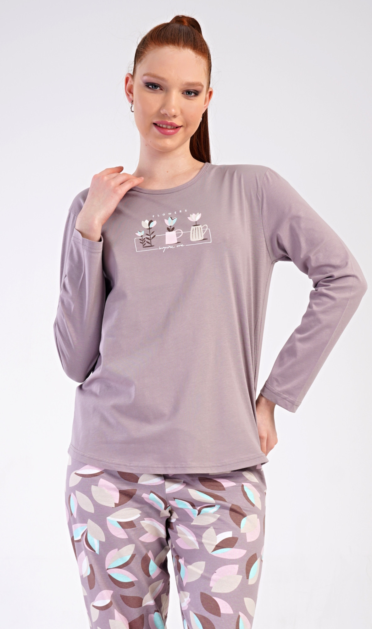 Dámské bavlněné dlouhé pyžamo Karla. Dámské pyžamo se skládá z trika s dlouhým rukávem a dlouhých kalhot. Jednobarevné triko je ozdobeno obrázkem květů. Tento motiv se opakuje i na kalhotách, které mají v pase gumu a šňůrku na stažení, nemají kapsy. Použitý bavlněný materiál je poddajný a příjemný na dotek. Pokyny pro údržbu: -100 % bavlna - lze prát v pračce při teplotě do 30° - nesušit v sušičce - žehlit z rubu do 110° - nepoužívat bělící prostředky - nečistit chemicky Míry naměřené na výrobku: 5020800821 Karla 1XL 2XL 3XL 4XL obvod hrudníku 114 116 118 120 délka trika 71 72 73 74 pas 80-92 84-96 86-98 90-102 délka kalhot 102 103 104 105
