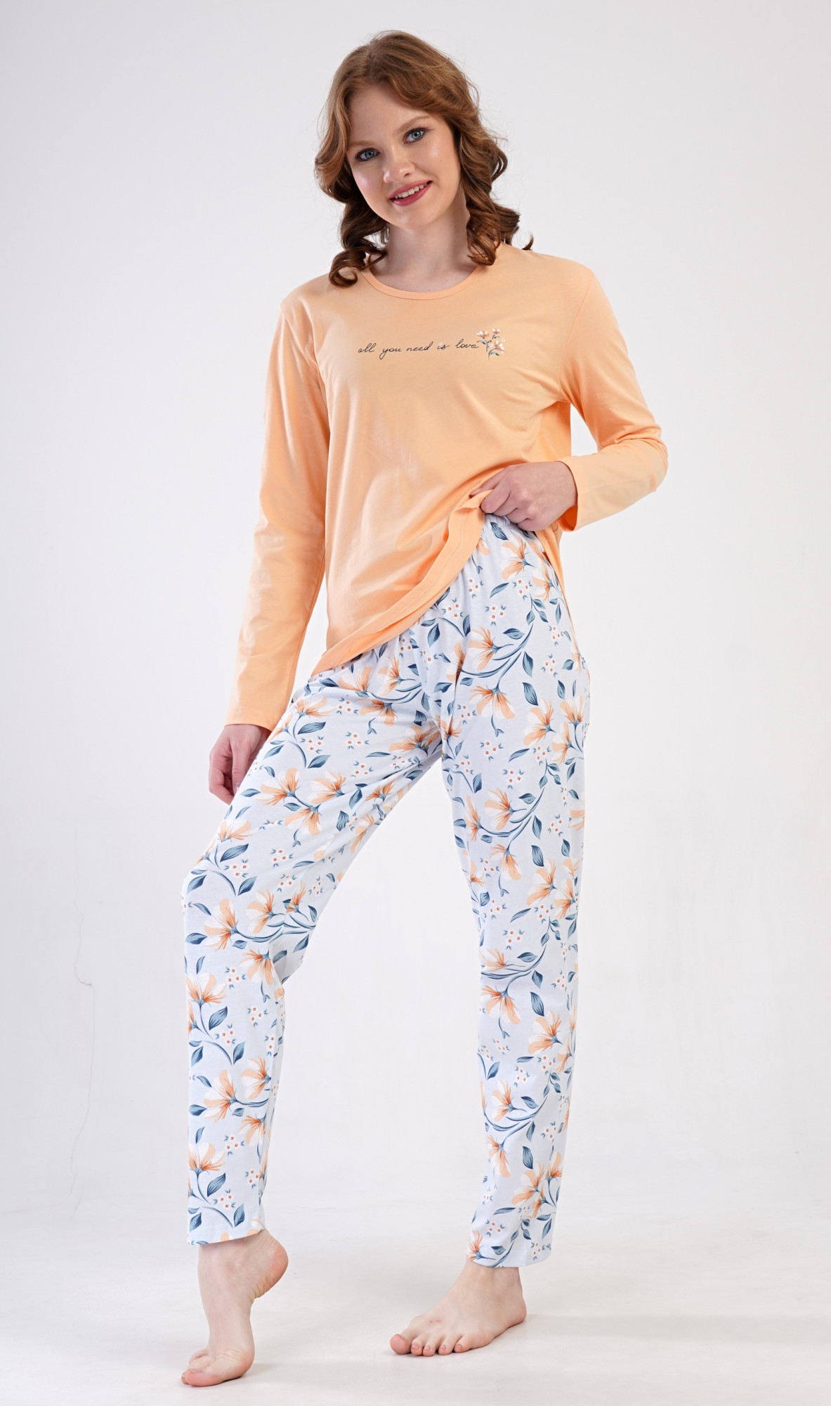 Dámské bavlněné dlouhé pyžamo Karolína. Dámské pyžamo se skládá z trika s dlouhým rukávem a dlouhých kalhot. Triko je jednobarevné, zdobené obrázkem drobných květů a nápisem 'all you need is love'. Květinový motiv se opakuje i na kalhotách, které mají v pase gumu a šňůrku na stažení, nemají kapsy. Použitý bavlněný materiál je poddajný a příjemný na dotek. Pokyny pro údržbu: -100 % bavlna - lze prát v pračce při teplotě do 30° - nesušit v sušičce - žehlit z rubu do 110° - nepoužívat bělící prostředky - nečistit chemicky Míry naměřené na výrobku: 4092040710 Karolína M L XL XXL obvod hrudníku 92 98 100 108 délka trika 64 65 66 67 pas 80-92 82-94 84-96 90-102 délka kalhot 100 100 100 102