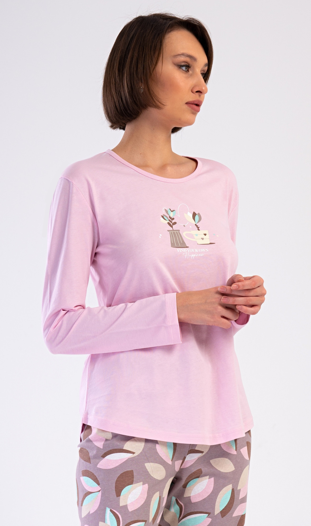 Dámské bavlněné dlouhé pyžamo Klárka. Dámské pyžamo se skládá z trika s dlouhým rukávem a dlouhých kalhot. Triko je jednobarevné, zdobené obrázkem květin v květináči. Květinový motiv se opakuje i na kalhotách, které mají v pase gumu a šňůrku na stažení, nemají kapsy. Použitý bavlněný materiál je poddajný a příjemný na dotek. Pokyny pro údržbu: -100 % bavlna - lze prát v pračce při teplotě do 30° - nesušit v sušičce - žehlit z rubu do 110° - nepoužívat bělící prostředky - nečistit chemicky Míry naměřené na výrobku: 4100220821 Klárka M L XL XXL obvod hrudníku 92 98 102 108 délka trika 63 64 65 66 pas 78-90 80-92 84-96 88-100 délka kalhot 103 103 103 105