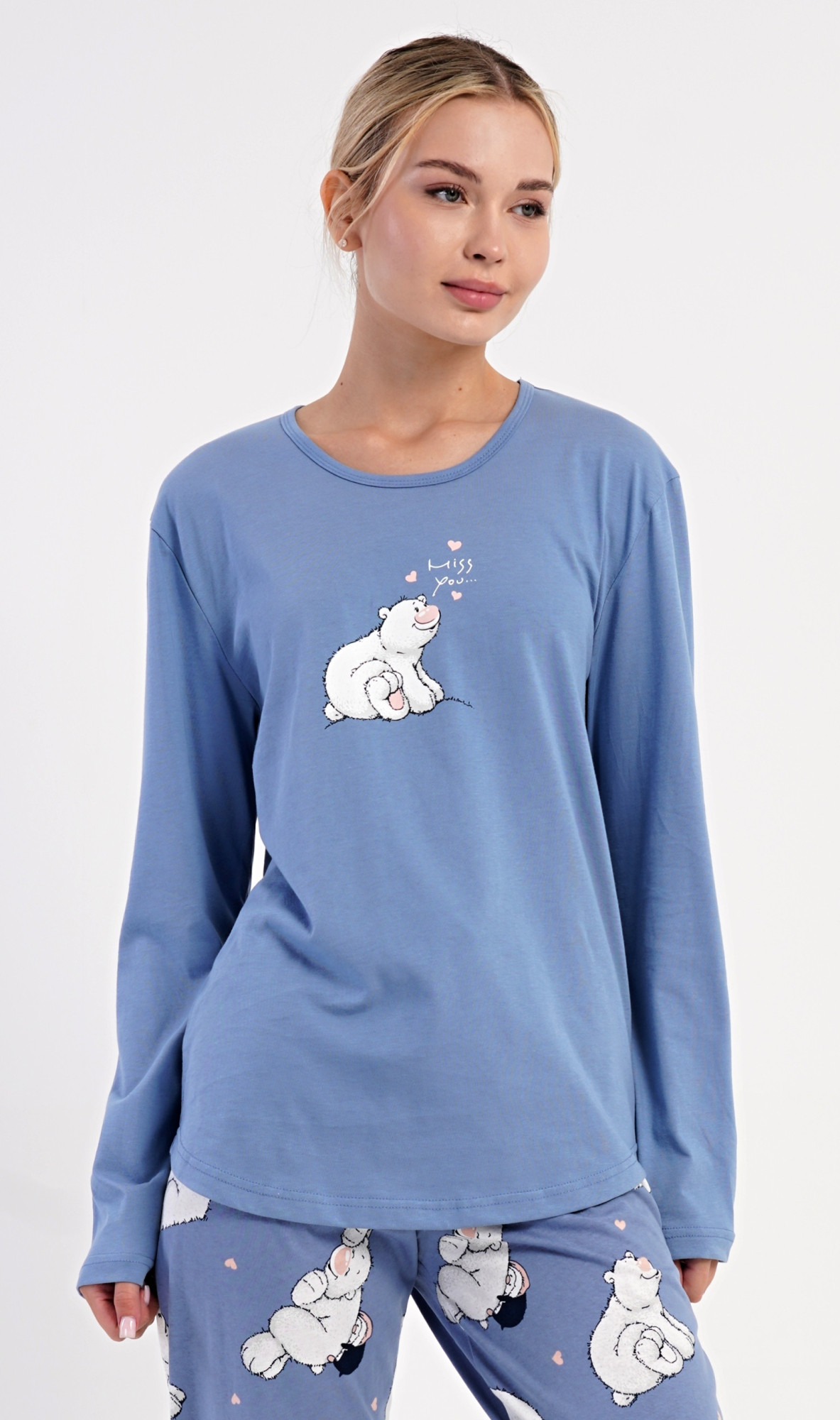 Dámské bavlněné dlouhé pyžamo Méďa a tučňák. Dámské pyžamo se skládá z trika s dlouhým rukávem a dlouhých kalhot. Triko s kulatým výstřihem je na hrudi zdobeno obrázkem ledního medvěda. Tento motiv se opakuje i na kalhotách, které mají v pase gumu a šňůrku na stažení, nemají kapsy. Použitý bavlněný materiál je poddajný a příjemný na dotek. Pokyny pro údržbu: - 100% bavlna - lze prát v pračce při teplotě do 30° - nesušit v sušičce - žehlit z rubu do 110° - nepoužívat bělící prostředky - nečistit chemicky Míry naměřené na výrobku 5040391122 Méďa a tučňák S M L XL obvod hrudníku 90 94 98 102 délka trika 61 62 63 64 pas 68-80 74-86 78-90 82-94 délka kalhot 100 101 102 103