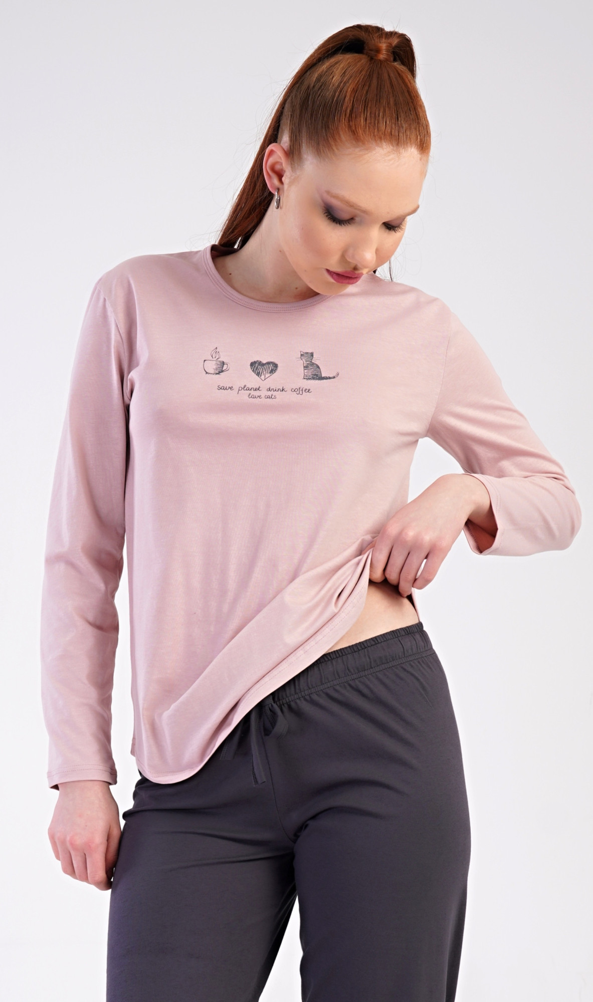 Dámské bavlněné dlouhé pyžamo Morning. Dámské pyžamo se skládá z trika s dlouhým rukávem a dlouhých kalhot. Triko je jednobarevné, zdobené obrázkem kotěte a drobným nápisem. Kalhoty mají v pase gumu a šňůrku na stažení, nemají kapsy. Použitý bavlněný materiál je poddajný a příjemný na dotek. Pokyny pro údržbu: - 100% bavlna - lze prát v pračce při teplotě do 30° - nesušit v sušičce - žehlit z rubu do 110° - nepoužívat bělící prostředky - nečistit chemicky Míry naměřené na výrobku: 5020640000 Morning S M L XL obvod hrudníku 90 94 98 102 délka trika 64 64 64 64 pas 70-82 74-86 76-88 78-90 délka kalhot 102 102 102 102