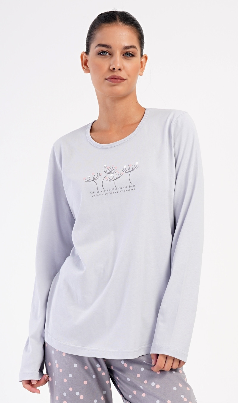 Dámské bavlněné dlouhé pyžamo Petra. Dámské pyžamo se skládá z trika s dlouhým rukávem a dlouhých kalhot. Triko je jednobarevné, zdobené obrázkem pampelišek a drobným nápisem. Kalhoty mají v pase gumu a šňůrku na stažení, nemají kapsy. Použitý bavlněný materiál je poddajný a příjemný na dotek. Pokyny pro údržbu: - 100% bavlna - lze prát v pračce při teplotě do 30° - nesušit v sušičce - žehlit z rubu do 110° - nepoužívat bělící prostředky - nečistit chemicky Míry naměřené na výrobku: 4031973024 Petra 1XL 2XL 3XL 4XL obvod hrudníku 108 112 122 126 délka trika 72 73 74 72 pas 80-92 82-94 84-96 88-100 délka kalhot 109 110 111 112