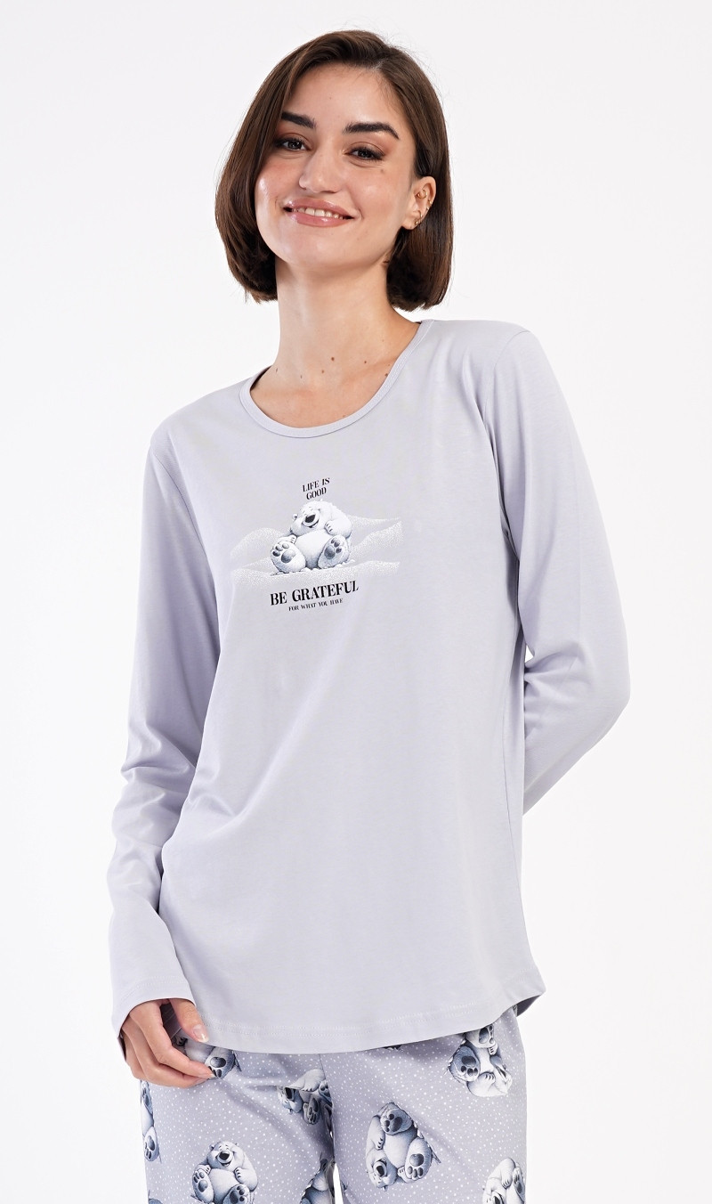 Dámské bavlněné dlouhé pyžamo Polar bear. Dámské pyžamo se skládá z trika s dlouhým rukávem a dlouhých kalhot. Triko je jednobarevné, zdobené obrázkem veselého ledního medvěda a nápisem 'Be grateful'. Obrázky medvědů se opakují i na kalhotách, které mají v pase gumu a šňůrku na stažení, nemají kapsy. Použitý bavlněný materiál je poddajný a příjemný na dotek. Pokyny pro údržbu: - 100% bavlna - lze prát v pračce při teplotě do 30° - nesušit v sušičce - žehlit z rubu do 110° - nepoužívat bělící prostředky - nečistit chemicky Míry naměřené na výrobku: 4051661180 Polar bear S M L XL obvod hrudníku 90 92 96 100 délka trika 63 64 65 66 pas 72-84 78-90 82-94 86-98 délka kalhot 100 101 102 103