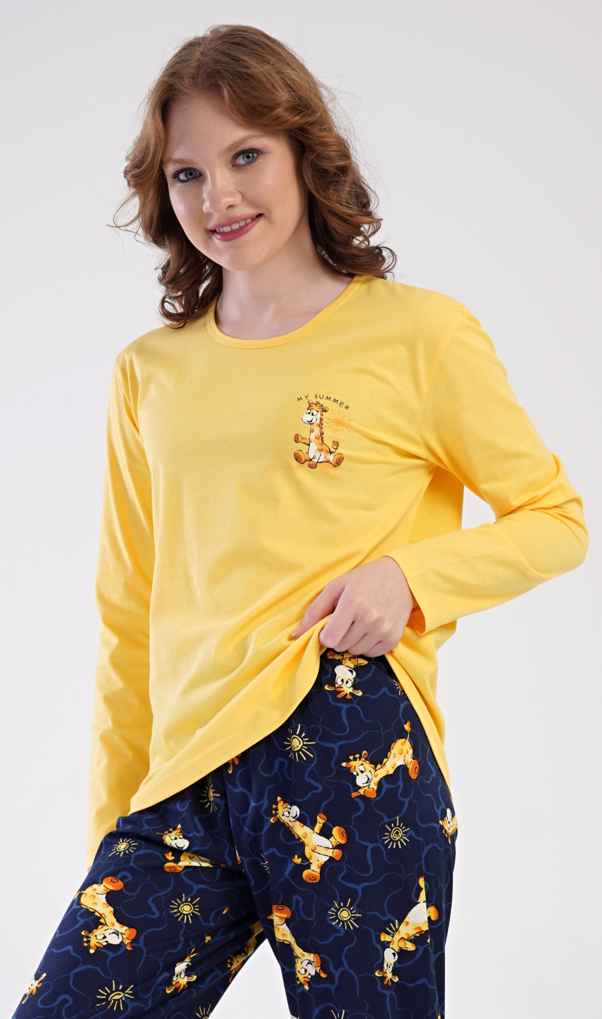 Dámské bavlněné dlouhé pyžamo Žirafy. Dámské pyžamo se skládá z trika s dlouhým rukávem a dlouhých kalhot. Triko je jednobarevné, zdobené obrázkem malé žirafy a nápisem MY SUMMER. Obrázky žiraf se opakují i na kalhotách, které mají v pase gumu a šňůrku na stažení, nemají kapsy. Použitý bavlněný materiál je poddajný a příjemný na dotek. Pokyny pro údržbu: - 100% bavlna - lze prát v pračce při teplotě do 30° - nesušit v sušičce - žehlit z rubu do 110° - nepoužívat bělící prostředky - nečistit chemicky Míry naměřené na výrobku: 4100117586 Žirafy S M L XL obvod hrudníku 90 94 96 102 délka trika 62 62 63 65 pas 72-84 74-86 76-88 82-104 délka kalhot 104 104 105 107
