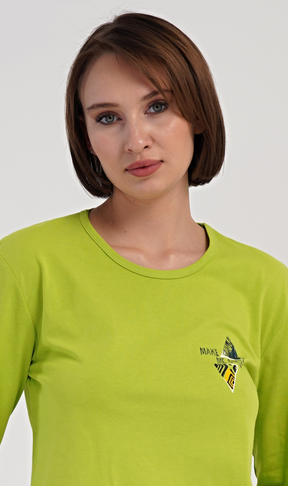 Dámské bavlněné dlouhé pyžamo Zuzana. Dámské pyžamo se skládá z trika s dlouhým rukávem a dlouhých kalhot. Triko je jednobarevné, zdobené malým obrázkem a nápisem 'Make me smile'. Kalhoty s geometrickým vzorem mají v pase gumu a šňůrku na stažení, nemají kapsy. Použitý bavlněný materiál je poddajný a příjemný na dotek. Pokyny pro údržbu: - 100% bavlna- lze prát v pračce při teplotě do 30°- nesušit v sušičce- žehlit z rubu do 110°- nepoužívat bělící prostředky- nečistit chemicky Míry naměřené na výrobku: 4100134921 Zuzana S M L XL obvod hrudníku 90 94 98 102 délka trika 61 62 64 66 pas 74-86 76-98 78-90 80-92 délka kalhot 98 100 100 100