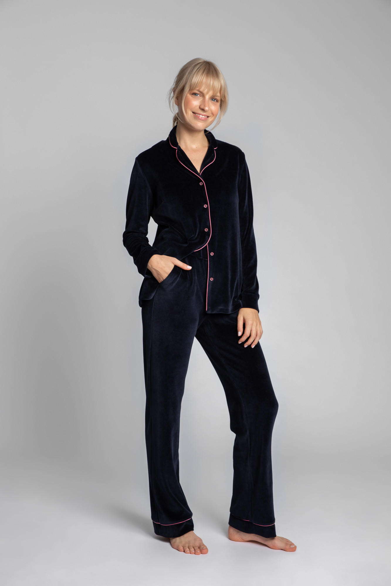 Spite, ale štýlovo v týchto zamatových nohaviciach s manžetami a ozdobným lemovaním, ktoré majú siluetu inšpirovanú pánskou módou. Vytvorte si súpravu s našou zamatovou pyžamovou košeľou s ozdobným lemovaním. Zloženie materiálu: 80% bavlna 20% polyester Pokyny pre starostlivosť: Pokyny pre pranie: Pranie v ruke pri 30 °C Farba: námornícka modrá Pohlavie: ženské Kolekcia: jar/leto/jeseň/zima