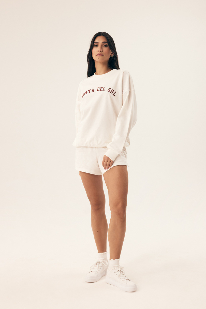 Bavlnené dámske pyžamo ideálne aj ako domáce oblečenie, športový strih, blúzka s dlhým rukávom, okrúhly výstrih, vyšívaný nápis na prednej strane, doplnené šortkami, manžetami, spodnou časťou trička a pásom ukončeným šnúrkou. Zloženie: 100 % viskóza