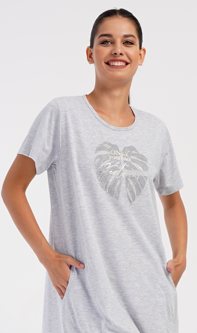 Dámské domácí šaty s krátkým rukávem Alžběta. Domácí jednobarevné šaty s kulatým výstřihem a kapsami zdobí obrázek velkého listu a nápis 'Only positive feeling'. Použitý bavlněný materiál je příjemný a poddajný na dotek. Šaty jsou pohodlné, využijete je téměř při všech volnočasových aktivitách. Jsou vhodné na spaní i na denní nošení. Obsah bavlny u tmavě šedé barvy je 100% a u světle šedé 70%. Pokyny pro údržbu: -70% bavlna, 30% polyester - lze prát v pračce při teplotě do 30° - nesušit v sušičce - žehlit z rubu do 110° - nepoužívat bělící prostředky - nečistit chemicky Míry naměřené na výrobku: 4053560000 Alžběta 1XL 2XL 3XL 4XL obvod hrudníku 124 130 136 142 obvod boky 130 136 142 148 délka 90 90 90 90