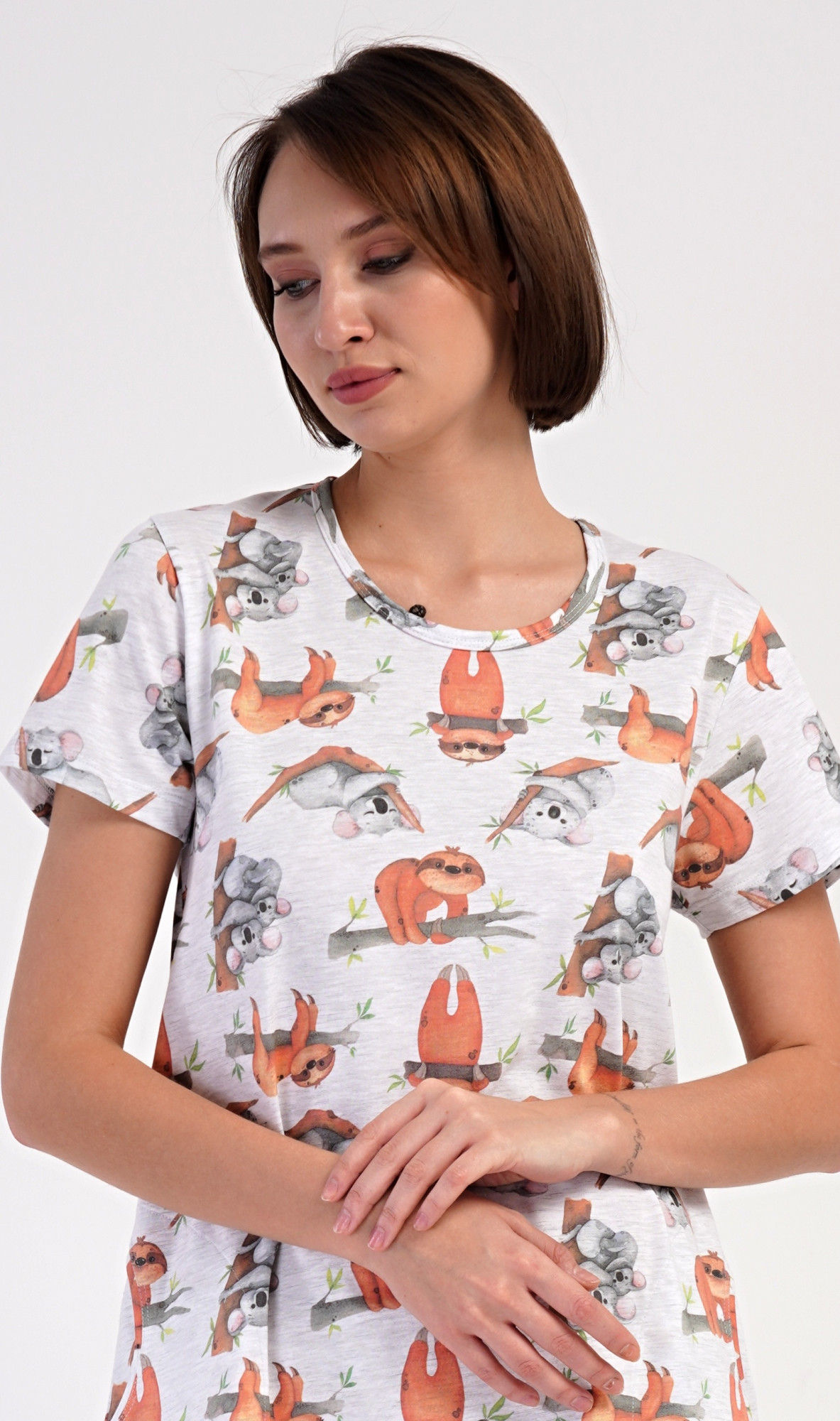 Dámské domácí šaty s krátkým rukávem Ospalci. Domácí šaty se vzorem ospalých medvídků mají kulatý výstřih a praktické kapsy. Použitý materiál s obsahem bavlny 70% je příjemný a poddajný na dotek. Šaty jsou pohodlné, využijete je téměř při všech volnočasových aktivitách. Jsou vhodné na spaní i na denní nošení. Pokyny pro údržbu: - 70% bavlna, 30% polyester - lze prát v pračce při teplotě do 30° - nesušit v sušičce - žehlit z rubu do 110° - nepoužívat bělící prostředky - nečistit chemicky Míry naměřené na výrobku: 4081841781 Ospalci S M L XL obvod hrudníku 92 96 98 102 obvod boky 104 110 114 118 délka 90 90 90 90