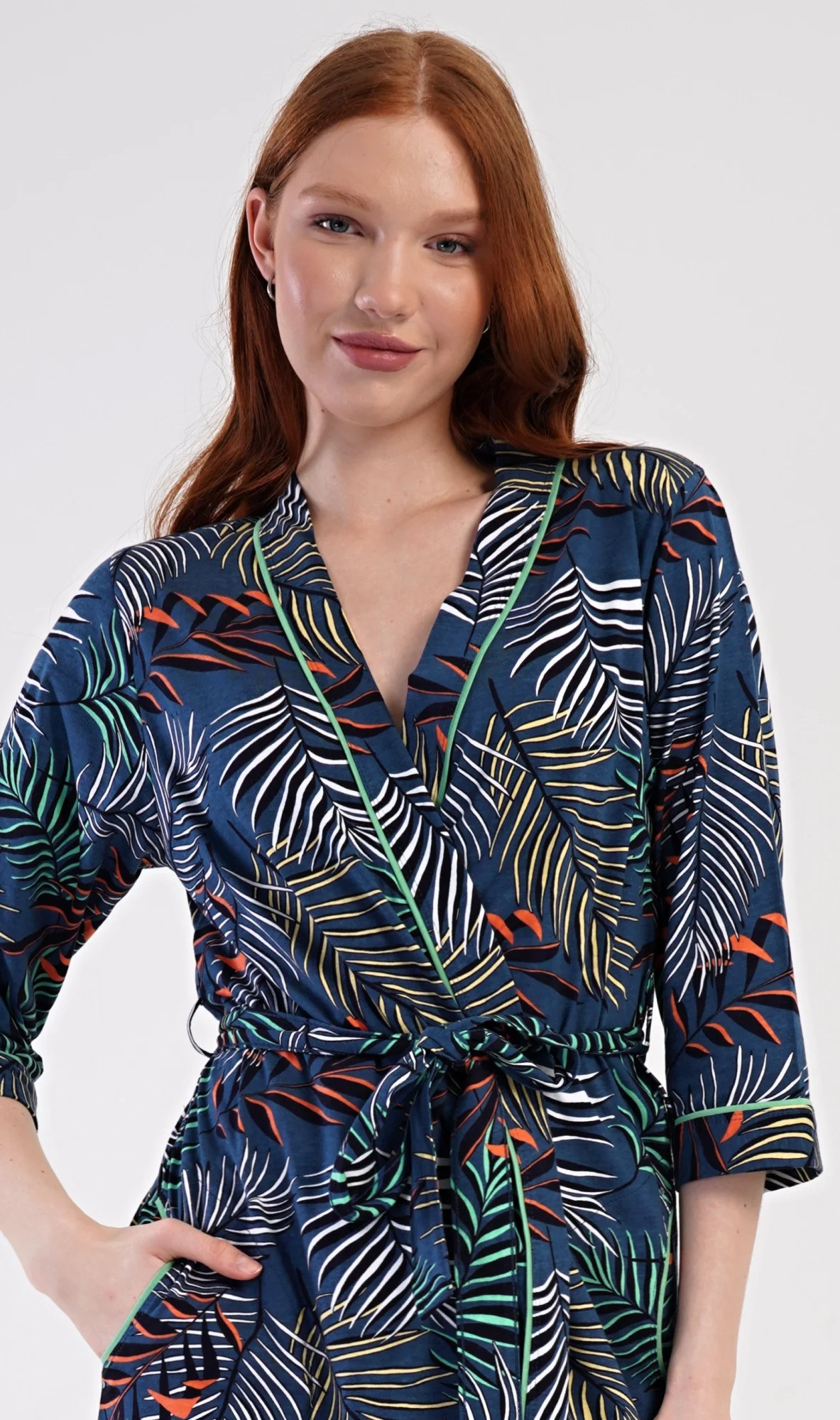 Dámský krátký bavlněný župan Barbara. Dámský župánek v délce pod kolena je potišten pestrobarevnými listy a větvičkami. Župan má pásek ke stažení a praktické kapsy. Použitý bavlněný materiál je příjemný a poddajný na dotek, saje a oceníte ho i po koupeli. Pokyny pro údržbu: - 100% bavlna- lze prát v pračce při teplotě do 30°- nesušit v sušičce- žehlit z rubu do 110°- nepoužívat bělící prostředky- nečistit chemicky Míry naměřené na výrobku: 4100675136 Barbara 1XL 2XL 3XL 4XL obvod hrudníku 120 126 132 138 obvod boky 130 138 146 154 délka županu 107 107 107 107