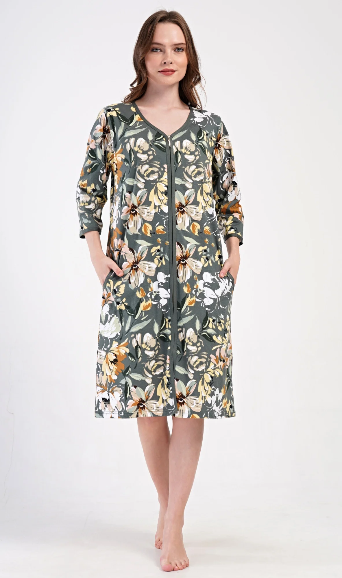 Dámské bavlněné domácí šaty s tříčtvrtečním rukávem Marie. Pohodlné rozepínací šaty v příjemné délce pod kolena využijete téměř při všech volnočasových aktivitách. Mají praktické kapsy a zapínání na zip. Šaty jsou potištěny květy. Použitý bavlněný materiál je příjemný a poddajný na dotek. Pokyny pro údržbu: -100 % bavlna- lze prát v pračce při teplotě do 30°- nesušit v sušičce- žehlit z rubu do 110°- nepoužívat bělící prostředky- nečistit chemicky Míry naměřené na výrobku: 4080190171 Marie 1XL 2XL 3XL 4XL obvod hrudníku 118 124 130 136 obvod boky 126 132 138 144 délka 103 104 105 106