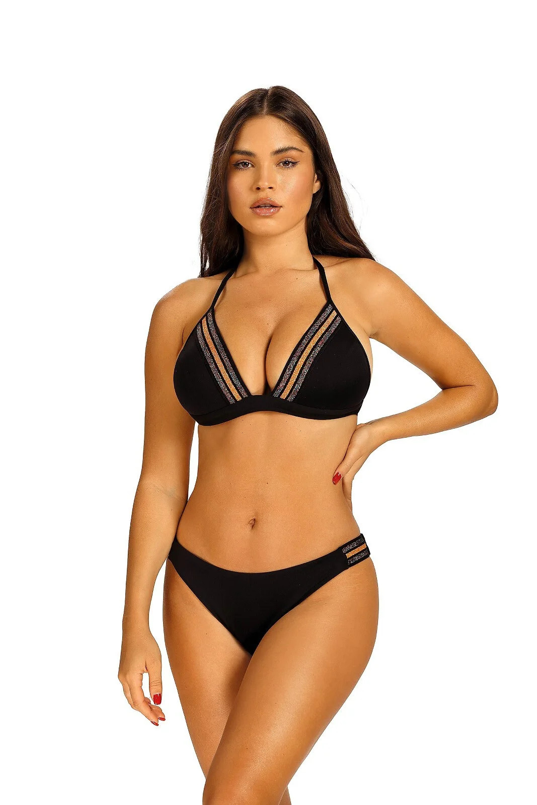Plavky, dvojdielne - podprsenka s vystuženými košíčkami - tepelne tvarovaná push-up podprsenka - zaväzovanie za krkom - zapínanie s nastaviteľnými ramienkami - odolná voči chlóru - pevné nohavičky, dvojvrstvové - podprsenka a nohavičky zdobené lesklým pásom Zloženie: 85 % polyamid, 15 % elastan