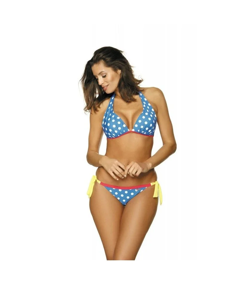 Módne dvojdielne plavky, ktoré oceníte ako pri plávaní, tak i pri opaľovaní. Podprsenka modelu sa zaväzuje za krkom, má vytvarované košíčky a vzadu pohodlné zapínanie na klip. Model má zvislé kostice. Vykrojené nohavičky sa na bokoch zaväzujú. Plavky zdobí vzor kontrastných bodiek. Model je vyrobený z veľmi kvalitnej talianskej látky Carvico Tesutti. Plavky rýchlo schnú a odolávajú pôsobeniu slnečných lúčov (nestráca farbu a tvar). Zloženie: 80% polyamid, 20% elastan.