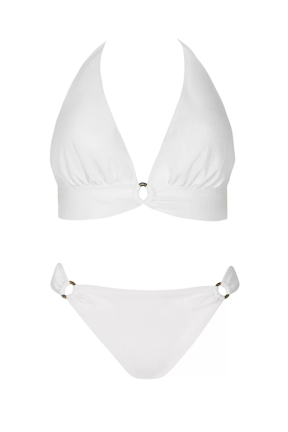 Dámske dvojdielne plavky - rebrovaný úplet - trojuholníkové košíčky - s vyberateľnými vypchávkami - viazanie v páse a za krkom - košíčky spojené krúžkom - plytké nohavičky s ozdobnými krúžkami na bokoch, vyšší strih - odolné voči chlóru - rýchloschnúce - odolné voči UV žiareniu Materiál: 85 % polyamid, 15 % elastan