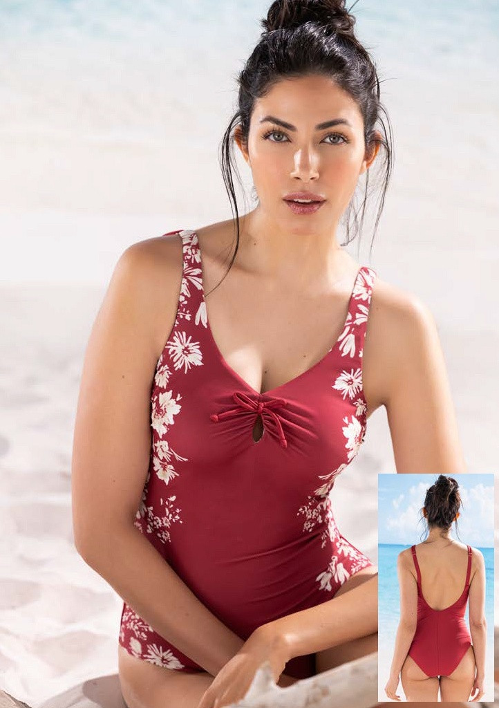 Dámske jednodielne plavky talianskej značky Siélei. Plavky majú všitú podprsenku, ktorá má vystužené košíčky. Pod košíčkami je vystužený pás, ktorý dobre drží prsia. Plavky majú dĺžkovo nastaviteľné ramienka. Plavky sú celé podšité rýchloschnúcou látkou. Plavky sú v peknej bordovej farbe a na bokoch sú svetlé kvety, ktoré vytvárajú zaujímavý kontrast k plavkám. Materiálové zloženie: 86 % polyamid, 14 % elastan