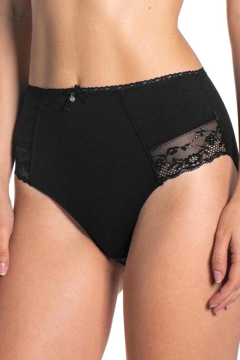 Klasický midi model so širokými bokmi a vysokým pásom. 2 diely v čiernej farbe s čipkovaným lemom na prednej strane. Veľmi univerzálny model. Plne konštruované nohavičky s vysokým pásom, ktorý čiastočne zakrýva brucho. V zadnej časti precízne zakrývajú zadoček. Spodná bielizeň tvarujúca siluetu. Pohodlná spodná bielizeň na každodenné nosenie. Materiálové zloženie: 95 % bavlna, 5 % elastan Balenie obsahuje obe verzie prezentovaného výrobku. .