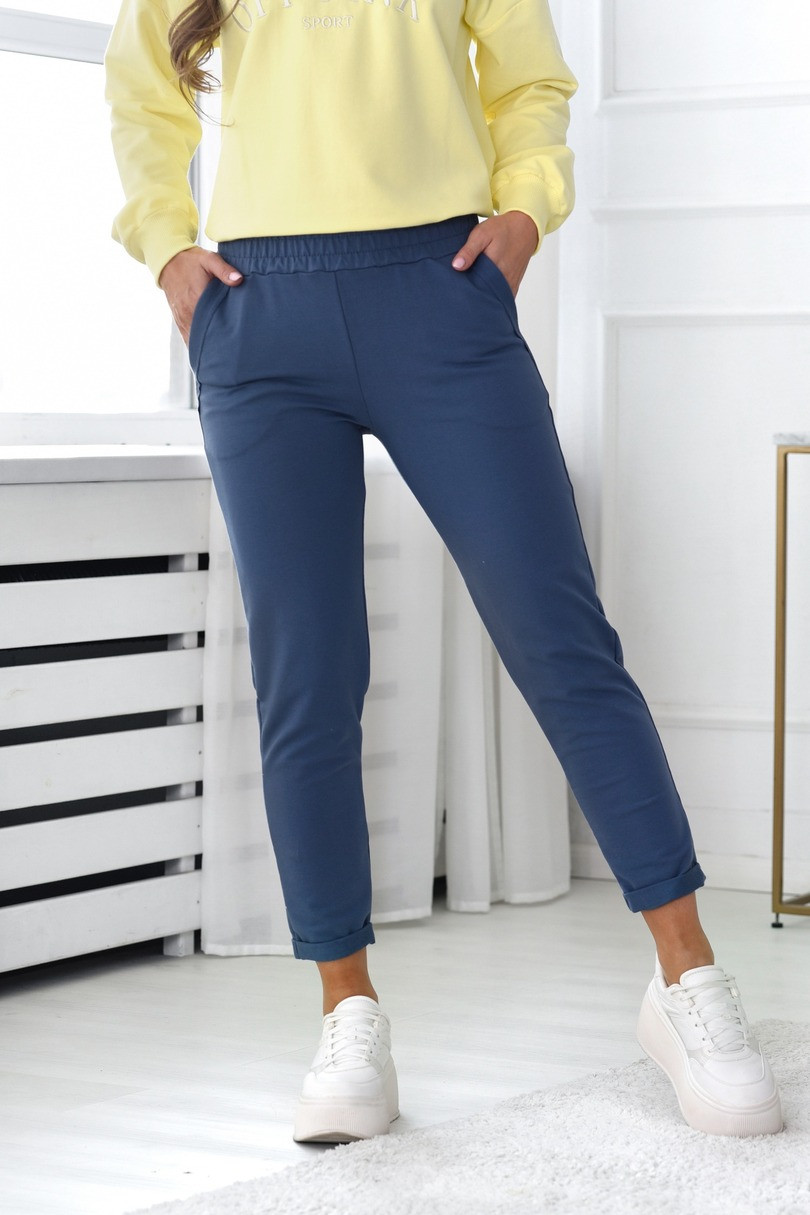 Dámske teplákové nohavice. Nohavice majú nohavice v 7/8 dĺžke. Spodný okraj nohavíc je vyhrnutý. V prednej časti modelu sú dve vrecká. Zadný diel nohavíc je hladký. Zloženie: 95% bavlna, 5% elastan.