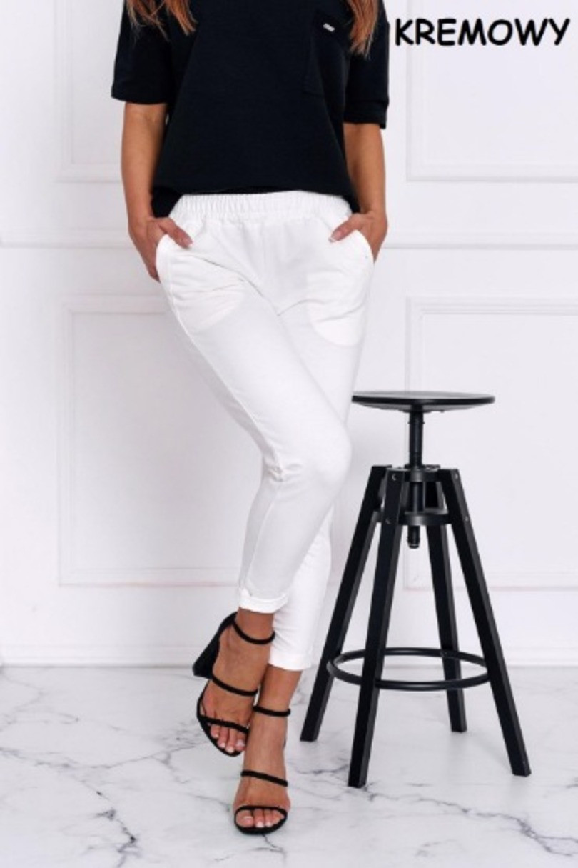 Dámske teplákové nohavice. Nohavice majú nohavice v 7/8 dĺžke. Spodný okraj nohavíc je vyhrnutý. V prednej časti modelu sú dve vrecká. Zadný diel nohavíc je hladký. Zloženie: 95% bavlna, 5% elastan.