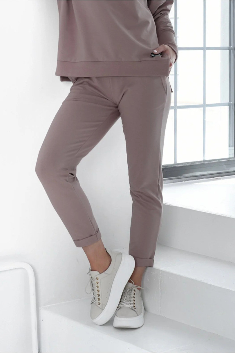 Dámske teplákové nohavice. Nohavice majú nohavice v 7/8 dĺžke. Spodný okraj nohavíc je vyhrnutý. V prednej časti modelu sú dve vrecká. Zadný diel nohavíc je hladký. Zloženie: 95% bavlna, 5% elastan.