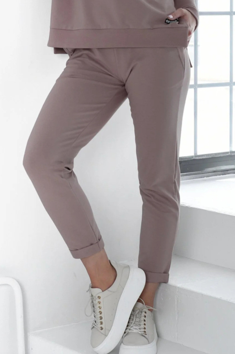 Dámske teplákové nohavice. Nohavice majú nohavice v 7/8 dĺžke. Spodný okraj nohavíc je vyhrnutý. V prednej časti modelu sú dve vrecká. Zadný diel nohavíc je hladký. Zloženie: 95% bavlna, 5% elastan.