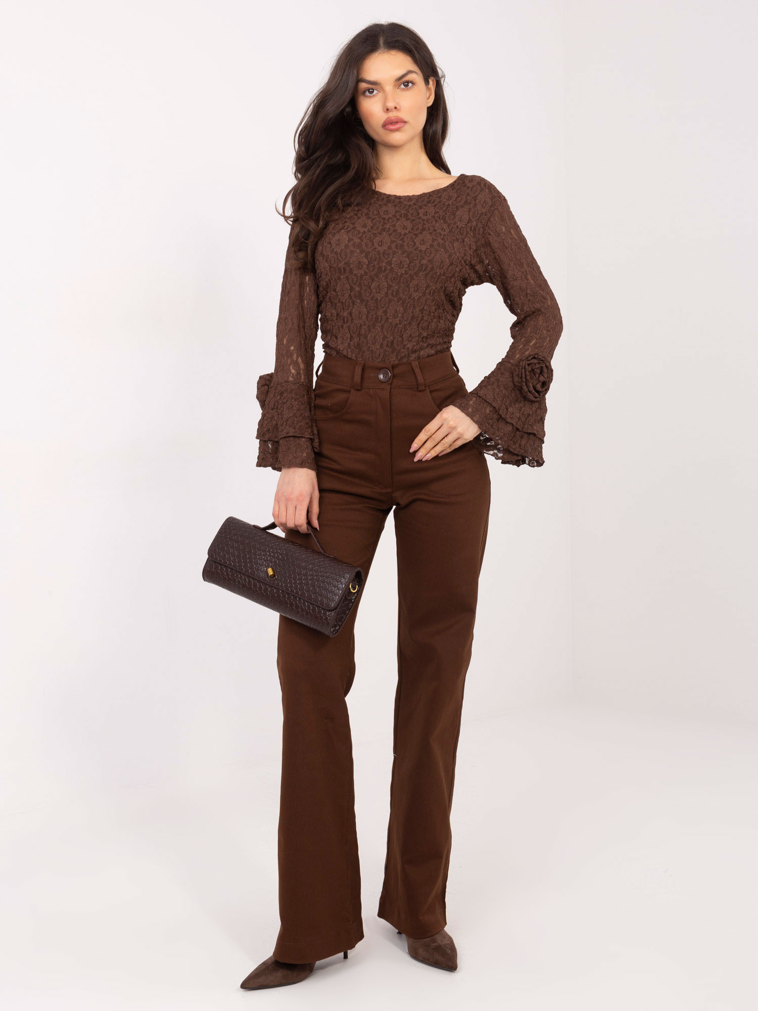Modelka má na sebe veľkosť 36. Rozmery modelky: výška 173 cm, prsia 85 cm, pás 62 cm, boky 95 cm. Rozmery nohavíc vo veľkosti 36: merané na plocho: šírka pása - 32 cm, šírka bokov - 43 cm, výška pása - 30 cm, celková dĺžka - 112 cm. Medzinárodná veľkosť Výška Obvod pása Obvod bokov Vonkajšia dĺžka nohavíc Vnútorná dĺžka nohy 36 S 160-168 72-80 88/90 86/87 73,5/74 38 M 162-172 78-86 92/94 89/90 74,5/75 40 L 164-174 84-90 100/102 93/94 75,5/76 42 XL 166-178 88-96 104/106 97/98 76,5/77 44 2XL 168-180 92-100 108/110 101/102 77,5/78 46 3XL 170-182 96-104 112/114 105/106 78,5/79