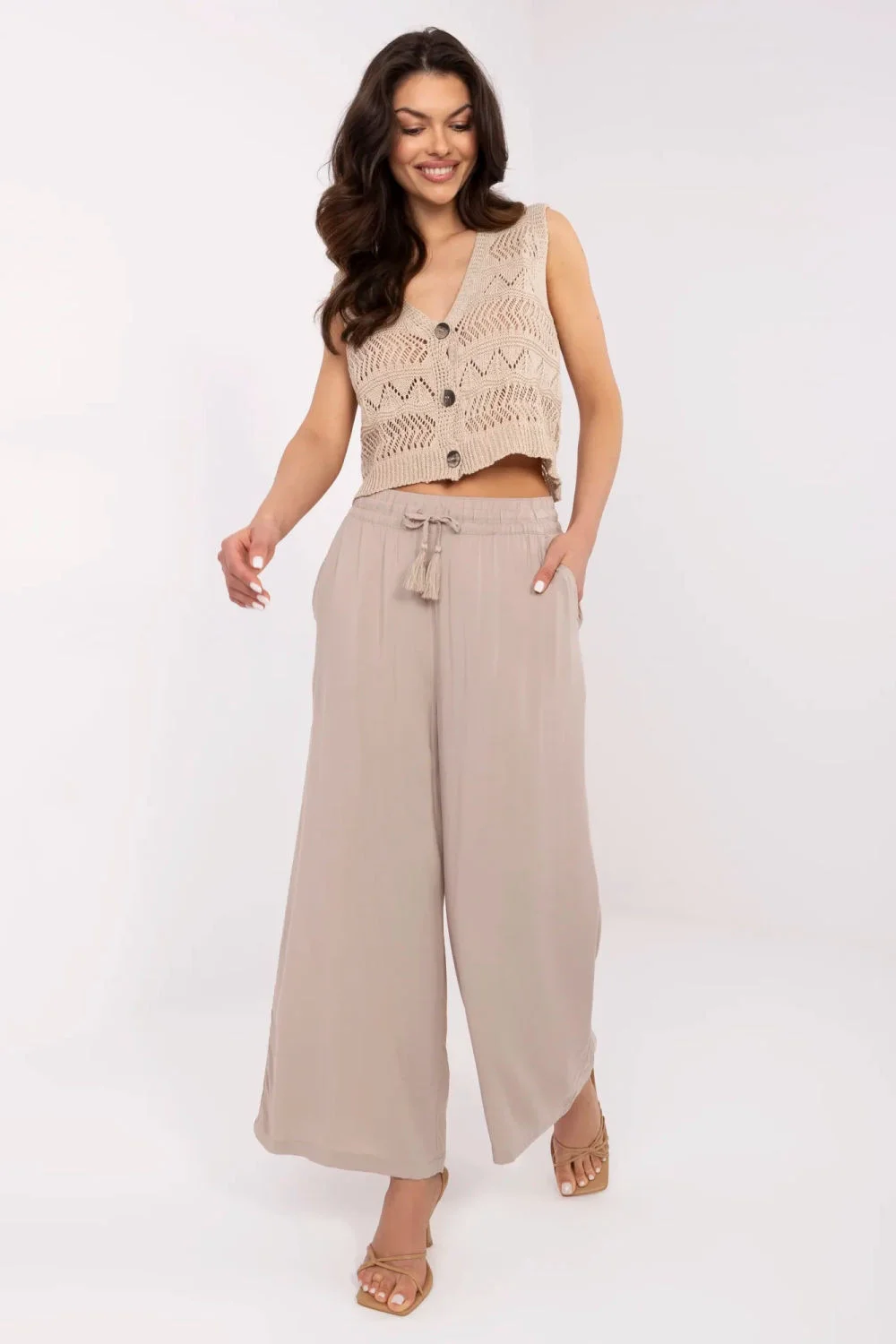Kalhoty palazzo jsou ideální volbou pro každodenní stylizace, spojující pohodlí s elegancí. Vyrobené z viskózy, která poskytuje měkkost a prodyšnost, se skvěle hodí jak na teplejší dny, tak i na chladnější večery. Široké nohavice jim dodávají volný, nonšalantní vzhled, který skvěle zapadá do ležérního stylu. Další výhodou jsou praktické vložené kapsy, které zvyšují funkčnost kalhot. Vysoký pas zdůrazňuje pas a opticky prodlužuje siluetu, což znamená, že tyto kalhoty jsou velmi výhodné pro každou postavu. Šňůrky na stahování umožňují ideální přizpůsobení pasu a absenci zapínání zaručuje pohodlí při nošení. Jednoduchý, jednolitý design činí tyto kalhoty všestranným prvkem šatníku, který lze snadno kombinovat s různými topy a doplňky. Jedná se o univerzální nabídku pro ženy, které si cení módy a pohodlí každý den. 100%viskóza Veľkosť DĺžkaŠírka bokov Šírka v páse L94 cm102 cm84-90 cmM90 cm94 cm78-86 cmS87 cm90 cm72-80 cmXL98 cm106 cm88-96 cmXS84 cm86 cm66-74 cm