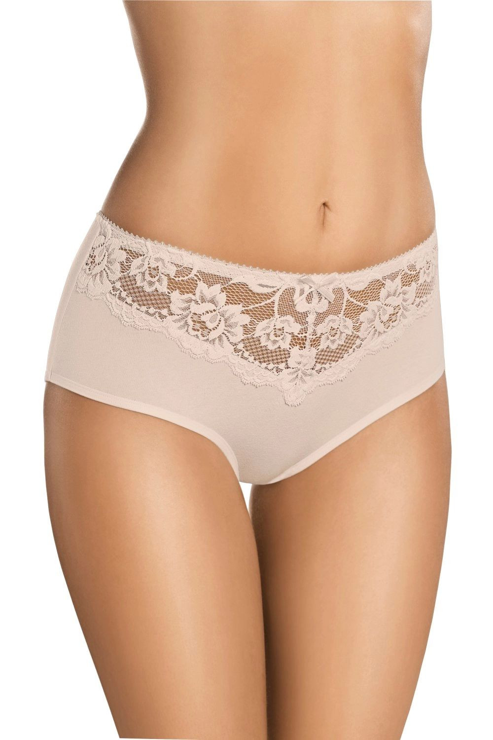 Dámske nohavičky 124 beige GABIDAR - béžová farba - klasický strih, ľahko zvýšený pás - predná strana je zdobená jemnou čipkou - elegantný dizajn - na hornom leme roztomilá mašlička Materiálové zloženie: 95% bavlna + 5% elastan