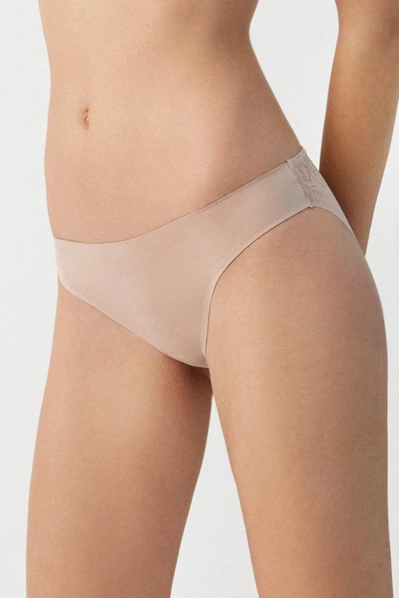 Dámske mini bikiny, hladká predná časť, jemná čipka na chrbte. Zloženie: 90 % polyamid, 10 % elastan Čipka: 84 % polyamid, 16 % elastan Vložka: 100 % bavlna .