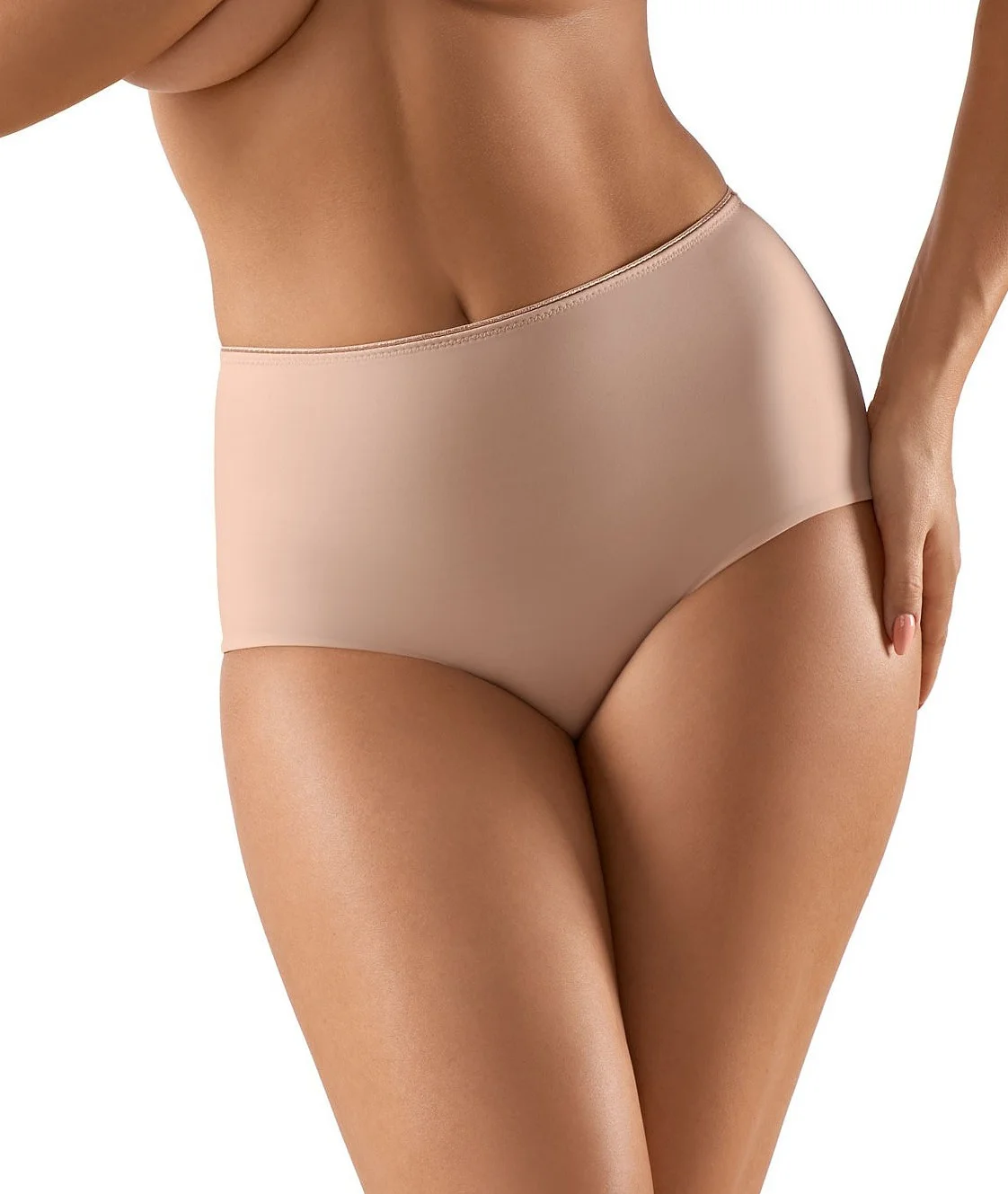 Tvarujúce hladké dámske nohavičky. Nohavičky sú vyrobené z pružnej látky. Predný diel modelu je podšitý vrstvou materiálu, vďaka ktorej nohavičky lepšie zoštíhľujú postavu. Boky modelu sú širšie. Nohavičky sú vo prednej časti obšité plochou gumou a vzadu sú strihané laserom. Zloženie: 80% polyamid, 20% elastan.