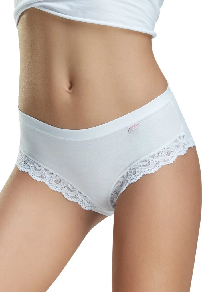 Dámske nohavičky klasického strihu značky Cotonella s vyšším pásom. Nohavičky sú kombináciou hladkej látky a kvetinové čipky v prednej časti obvodu nohavičiek. V hornom obvode je vsadená aplikácie s logom Cotonella. Do vnútorného dielu je zapracovaný bavlnený klin z BIO bavlny pre komfortné nosenie. Materiálové zloženie: 86% bavlna, 7% polyamid, 7% elastan.