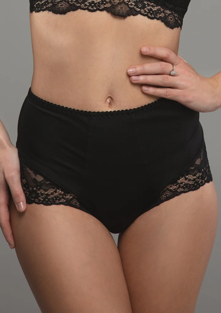 Dámske vyššie nohavičky značky Fantasy. Nohavičky majú vyšší pás a krásne vytvarujú postavu pod oblečenie. Majú mierne sťahovací efekt. Predná časť je hladká. V prednom diele vo všitý širší klin, ktorý je z vnútornej strany podšitý bavlnenou látkou na komfortné nosenie. Na spodnej časti nohavičiek je z boku našitá ozdobná a pružná čipka, ktorá ďalej pokračuje až na zadoček. Zadná časť nohavičiek je hladká. Materiálové zloženie: 75% polyamid, 15% elastan, 10% bavlna