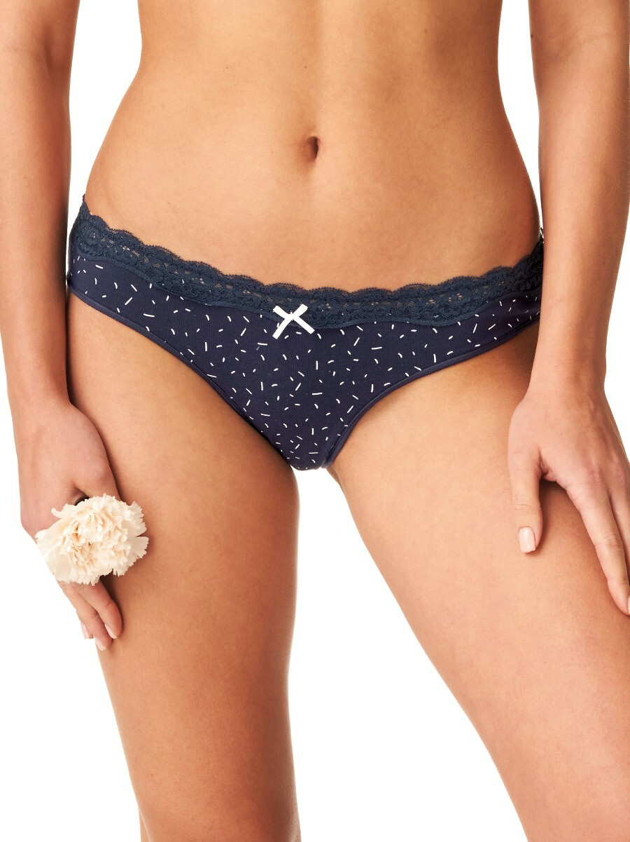 Dámske mini bikiny - vyrobené z kvalitnej bavlny - nízka línia bokov - elastická čipka v páse - saténová mašľa uprostred - balené v dvoch kusoch Zloženie: 95 % bavlna, 5 % elastan