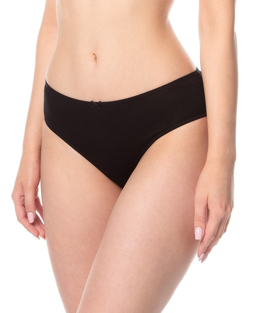 Bavlnené nohavičky s plnšími bokmi. Model má plochý elastický pás a mašľu. Nohavičky sú zabalené vo fóliovom vrecku po troch kusoch - dva sú vzorované a jeden jednofarebný. Zloženie materiálu: 95% bavlna, 5% elastan