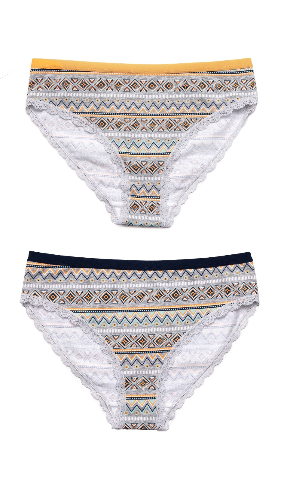 Dámske bavlnené nohavičky- klasický strih, bikiny - bavlna zdobená etnickým vzorom- plochý, jednotný elastický pás- balené v krabici po dvoch kusochZloženie: 95% bavlna, 5% elastan