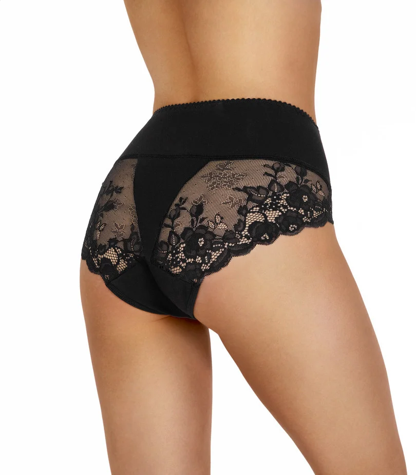 Čipkované dámske nohavičky s vysokým pásom. Odzobené saténovými mašličkami. Pozadie krajkové. Zloženie: 85% polyamid, 15% elastan.