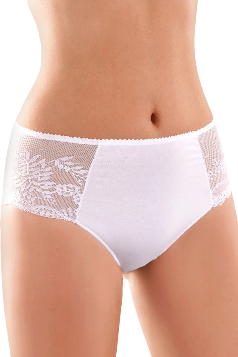 Vysoké bavlnené dámske nohavičky s čipkovou vsadkou na bokoch. Zloženie: 95% bavlna, 5% elastan.