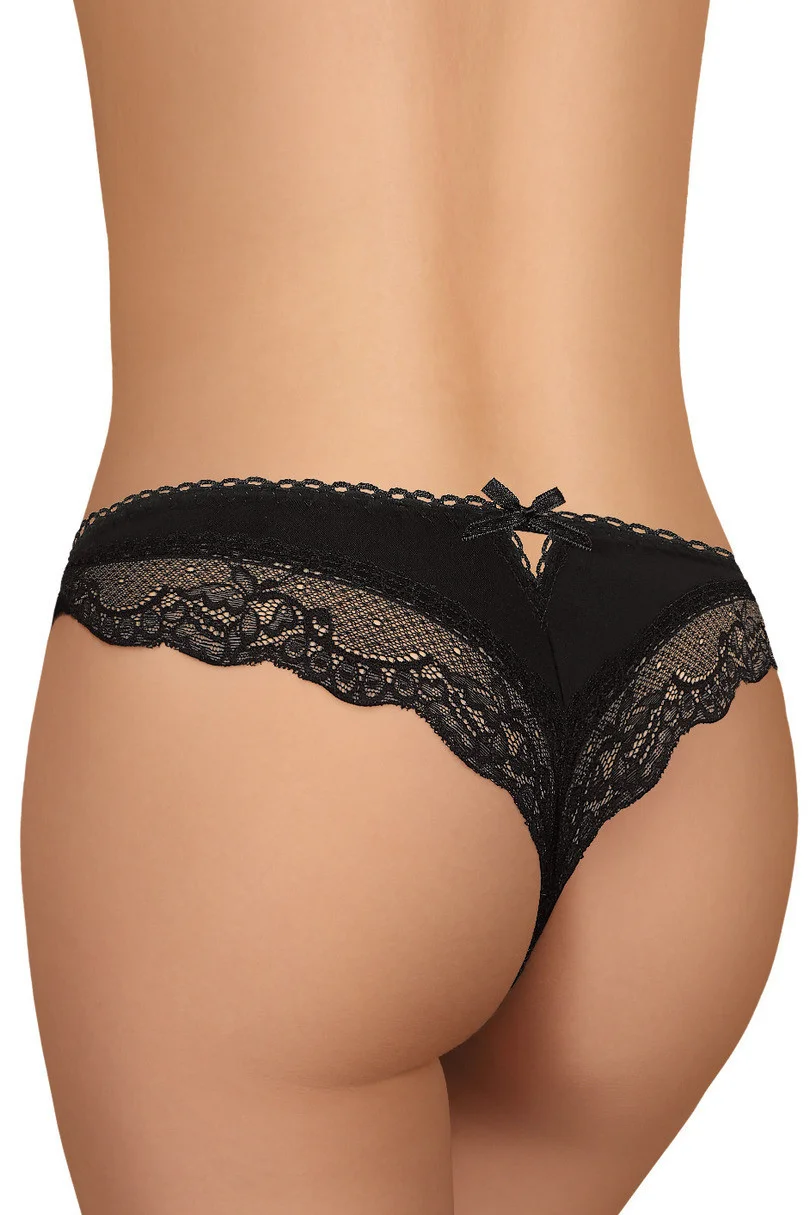 Prekrásne dámske nohavičky "stringo-šortky", ktoré sú vyrobené z bodkovanej azúrovej sieťoviny. Boky a zadný diel modelu zdobí čipka s kvetinovým motívom. Pás je ušitý z hladkého mikrovlákna. Predný aj zadný diel nohavičiek je ozdobený malou mašličkou. Zloženie: 85% polyamid, 15% elastan.