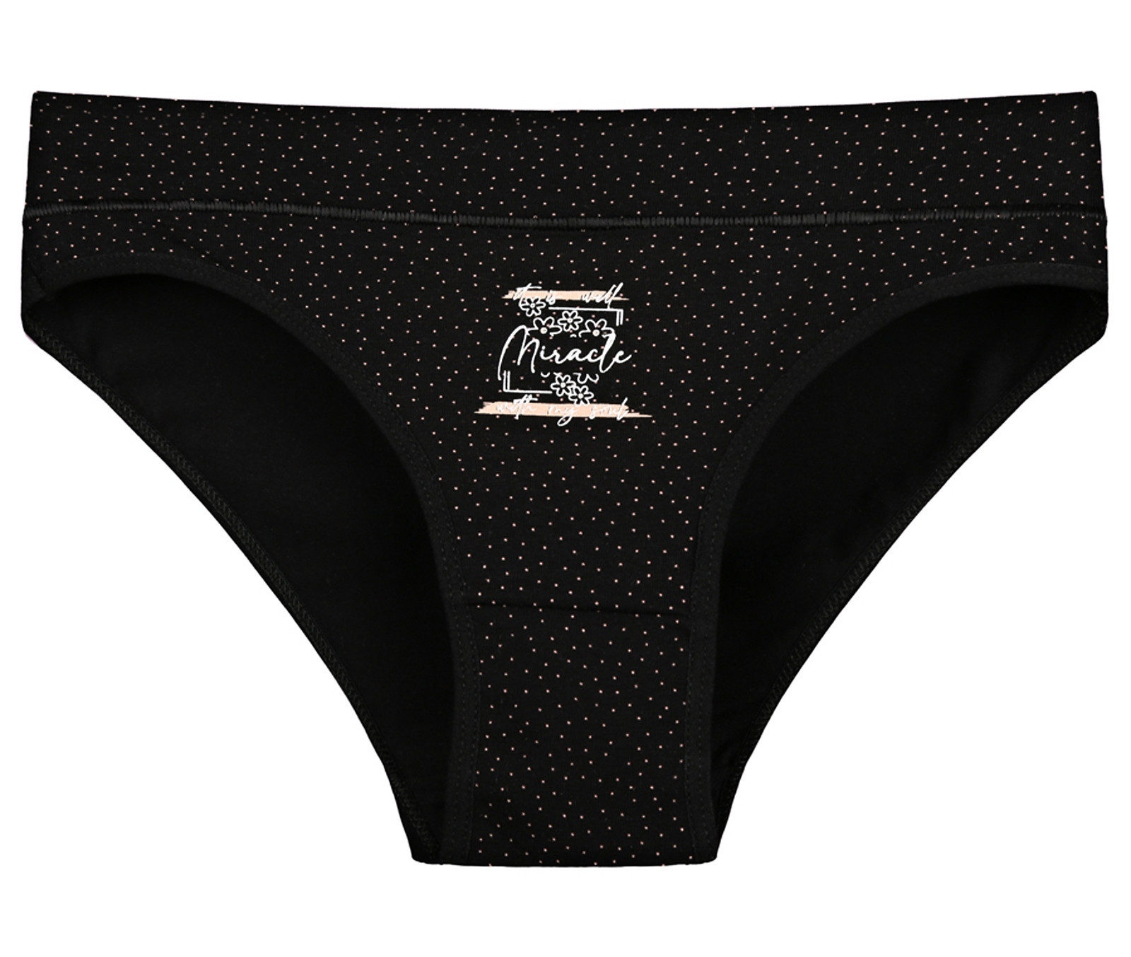 Dámské bavlněné kalhotky Miracle. Slušivé klasické kalhotky zdobené drobným nápisem jsou pohodlným typem spodního prádla pro všechny příležitosti. Obzvláště oceníte materiálové složení - 95% bavlna a 5% elasten. Použitý materiál je příjemný a poddajný na dotek.