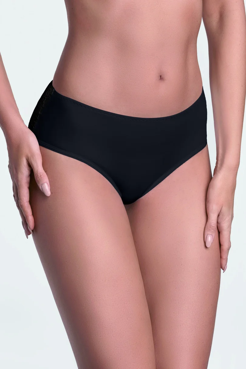 Dámske nohavičky hladké a nepriehľadné vpredu a zvodne priesvitné na zadočku.Zadná časť zo sieťovaného tylu a čipky..