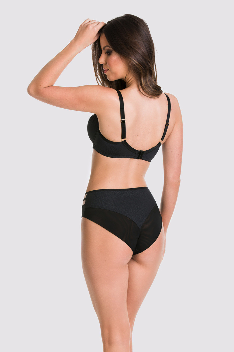 Celočierne nohavičky z mikrovlákna, tylové boky s našitými čiernymi pruhmi. Zloženie materiálu: 78% polyamid, 12% elastan, 5% polyester, 5% bavlna. .